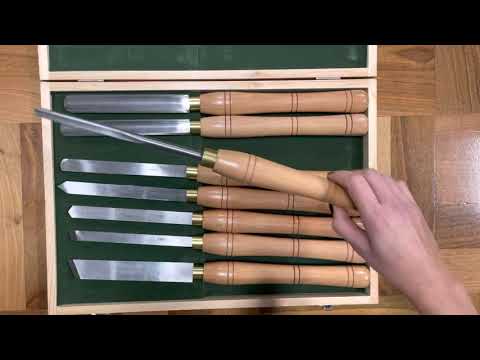 1/2" Skew Chisel, 1" Skew Chisel, 3/4" Round Nose Scraper, 3/4" Parting Tool, 3/4" Diamond Parting Tool, 1/2" Spindle Gouge, 3/4" Roughing Gouge, 1" Roughing Gouge, 1 x Wooden Storage Carry Case